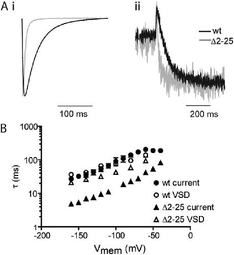 Figure 4. Effect of N-terminal truncation on kinetics of hERG deactivation. (A) Typical examples of ionic current (i) and fluorescence (ii) recorded after repolarization to −120 mV from a depolarized holding potential for E518C and Δ2–25 hERG. The fast time constant (τfast) for deactivation of ionic current was derived from a fit of a double exponential function to the decaying phase of the current after repolarization. Time constants for VSD return were derived from fits of a single exponential to the decaying phase of the fluorescence record. (B) Summary of the voltage dependence of rates of deactivation and VSD return for E518C and Δ2–25 hERG channels. Error bars are SEM; n ≥ 7.
