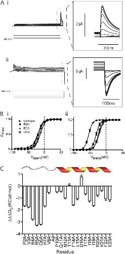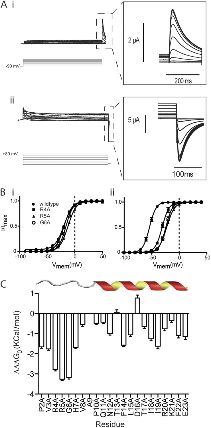 Figure 5. Alanine scan of N-terminal tail. (A) Example traces recorded in response to protocols shown to measure the voltage-dependent equilibria of activation (i) and deactivation (ii) ionic current in R4A hERG channels. Insets are expansions of the highlighted regions. (B) Summary of voltage-dependent equilibria of activation (i) and deactivation (ii) for R4A, R5A, and G6A mutants. Solid lines are fits of the Boltzmann equation to data. V0.5 values for activation were measured as 3.7 ± 1.1 mV, 2.8 ± 1.3 mV, and −3.4 ± 1.5 mV for R4A, R5A, and G6A, respectively (SEM; n > 4). For deactivation of ionic current, V0.5 values were measured as −19.3 ± 2.5 mV, −10 ± 0.9 mV, and −16.1 ± 1.2 mV for R4A, R5A, and G6A, respectively (SEM; n > 5). (C) Mutation-dependent changes (termed ΔΔΔG0) in the difference (ΔΔG0) between the free energy terms associated with the voltage-dependent equilibrium of deactivation (ΔG0, deact) and activation (ΔG0, act) relative to wild-type hERG (SEM; n ≥ 21). Three amino acid residues in this region, R4A, R5A, and G6A, contribute strongly to coupling with ΔΔΔG0 of ∼3 kcal/mol.