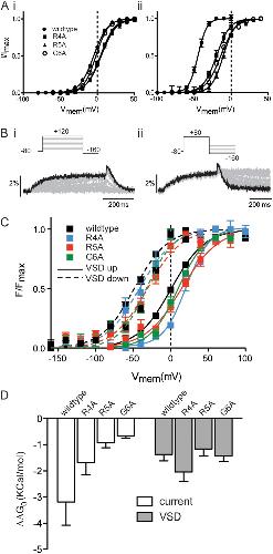 Figure 6. Voltage-clamp fluorometry of residues contributing to coupling. (A) Summary of the voltage-dependent equilibria of activation (i) and deactivation (ii) of ionic current for R4A, R5A, and G6A mutants in the E518C background. Solid lines are fits of the Boltzmann equation to data. (B) Example fluorescent traces recorded from MTSR-labeled R4A E518C hERG using voltage-clamp fluorometry in response to the protocols shown to measure upward motion (i) and return (ii) of the VSD. (C) Summary of the voltage-dependent equilibria of VSD upward motion and return. V0.5 values for VSD upward motion were −1.4 ± 2 mV, 20.9 ± 2.6 mV, 10 ± 3.5 mV, and 6.2 ± 3.8 mV for E518C, R4A, R5A, and G6A, respectively (SEM; n > 4). V0.5 values for VSD return were −46.4 ± 1 mV, −34.5 ± 7.2 mV, −29.6 ± 3.8 mV, and −29.0 ± 4.4 mV for E518C, R4A, R5A, and G6A, respectively (SEM; n > 4). (D) Difference between free energy terms (ΔΔG0) associated with the voltage-dependent equilibrium of current deactivation relative to current activation (open) and VSD return relative to VSD upward motion (gray; SEM; n ≥ 6).