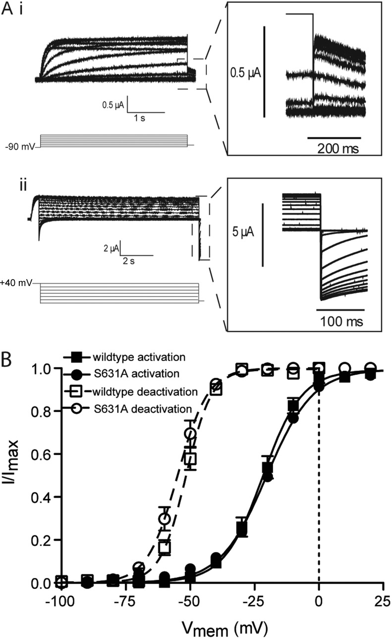 Figure 7. Mode shift of ionic current in S631A hERG. (A) Example traces recorded in response to the protocols shown to measure the voltage-dependent equilibria of activation (i) and deactivation (ii) of ionic current in inactivation-deficient S631A hERG channels. Insets are expansions of the highlighted regions. (B) Summary of the voltage-dependent equilibria of activation and deactivation. Solid lines are fits of the Boltzmann equation to activation data, whereas broken lines are fits of the Boltzmann equation to the deactivation data. Neither the V0.5 values for activation (−20.32 ± 0.5 mV and −21.7 ± 0.7 mV for wild type and S631A, respectively, SEM; n ≥ 5) nor deactivation (−54.9 ± 1.6 mV and −50.72 ± 0.9 mV for wild type and S631A, respectively, SEM; n = 4) were significantly different from wild type (Student’s t test, P < 0.05).