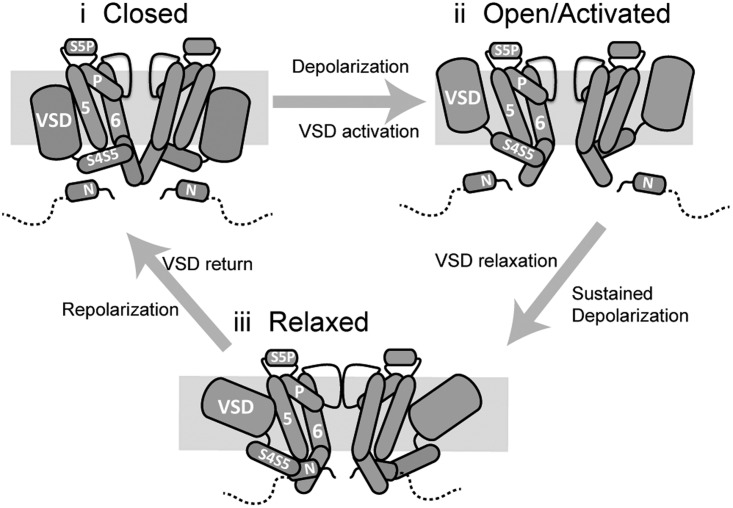 Figure 8. A simple domain level model of coupling of VSD mode shifting to the gate during hERG activation/deactivation. (i) In the closed state, the N-terminal tail does not directly interact with the gate. (ii) Upon depolarization, the VSD moves in the membrane into the activated state. This upward motion is coupled to opening of the gate via direct interactions of the S4–S5 and the S6 helix. (iii) With sustained depolarization, the VSD relaxes. Relaxation of the VSD is accompanied by a conformational change of the S4–S5 linker that causes it to dissociate from its binding site on the S6. The N-terminal tail then acts as an adaptor between the S4–S5 and S6 to couple VSD return during repolarization to closing of the gate.