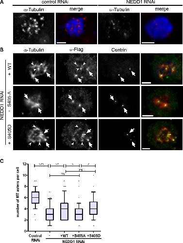 Figure 3. NEDD1 Phosphorylation at Ser405 Is Essential for Chromosome-Dependent MT Nucleation(A) Immunofluorescence images of control and NEDD1-silenced HeLa cells incubated in nocodazole and fixed 5 min after washout. NEDD1-silenced cells are strongly impaired for MT regrowth. In the merge, MTs are in red and DNA is in blue. Scale bar represents 5 μm.(B) Immunofluorescence images of NEDD1-silenced HeLa cells expressing RNAi-resistant Flag-hNEDD1 (+WT), Flag-hNEDD1 S405A (+S405A), or Flag-hNEDD1 S405D (+S405D) incubated in nocodazole and fixed 5 min after washout. The centrosomes (indicated by arrows) are visualized by GFP-centrin (here shown in blue) stably expressed in this HeLa cell line. The recombinant proteins are detected with anti-Flag antibodies (displayed in green), and tubulin is shown in red. Chromosomal MTs marked with arrowheads are absent in cells expressing Flag-hNEDD1 S405A. Scale bar represents 5 μm.(C) Quantification of the number of MT asters per cell, 5 min after nocodazole washout. In the box-and-whiskers plot, boxes show the upper and lower quartiles (25%5%) with a line at the median, whiskers extend from the 10th to the 90th percentile, and dots correspond to outliers. ∗p ≤ 0.05; ∗∗p ≤ 0.01; ∗∗∗p ≤ 0.005. The graph shows one representative experiment out of nine independent experiments (each with n ≥ 30).See also Figure S4.
