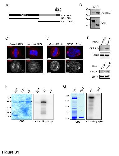 (F) In vitro kinase assay with Xenopus proteins: His-xAurora A phosphorylates specifically the C- terminal domain of xNEDD1 (CT). Control GST and the N-terminal domain of xNEDD1 (NT) are not phosphorylated. The CBB stained gel and the corresponding autoradiography are shown. The asterisk indicates a degradation product of GST-xNEDD1 NT.