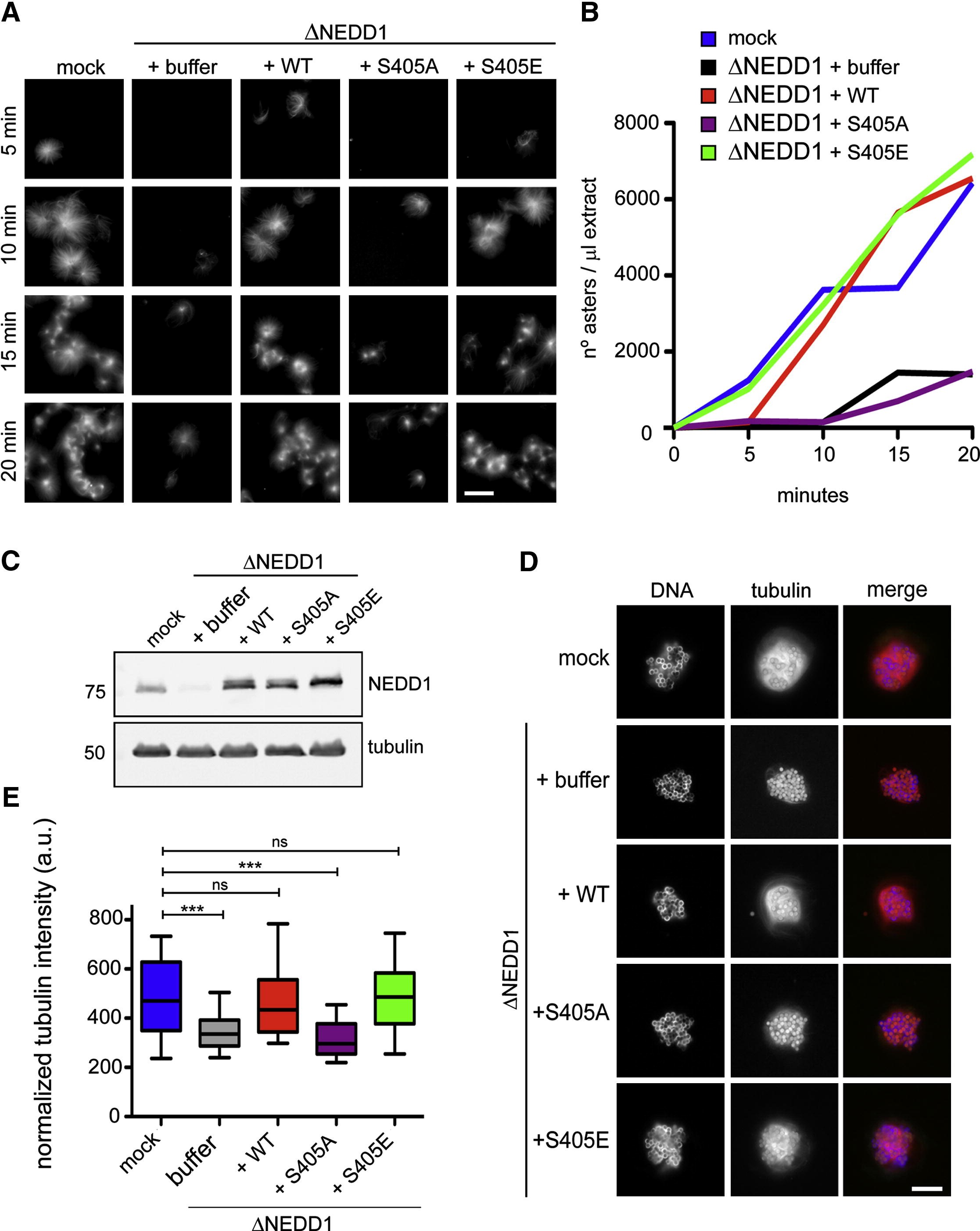 Figure 4. NEDD1 Ser405 Phosphorylation Is Essential for Chromatin- and RanGTP-Dependent MT Nucleation in Xenopus laevis Egg Extracts(A) RanGTP asters formed in control mock-depleted egg extract (mock), NEDD1-depleted extract (+buffer), and depleted extract supplemented with human recombinant flag-NEDD1 (WT), Flag-NEDD1 S405A (+S405A), or Flag-NEDD1 S405E (+S405E). The images correspond to squashes taken at 5, 10, 15, and 20 min after RanGTP addition to a CSF extract. MTs are visualized by addition of rhodamine tubulin to the extract. Scale bar represents 25 μm.(B) Quantification of the number of RanGTP asters in each experimental condition. The graph shows one representative experiment out of four independent experiments.(C) Western blot analysis of the extracts used for (A) and (B) showing that endogenous NEDD1 in mock extract was efficiently depleted, and showing the different recombinant proteins that were added to the depleted extract. The tubulin signal is shown as loading control.(D) Images of DNA-coated beads incubated in cycled extract as indicated for 30 min. Rhodamine tubulin was added to the extract for visualization. DNA was stained with Hoechst. Note that the beads are autofluorescent. Scale bar represents 25μm.(E) Quantification of the DNA bead-dependent MT nucleation shown in (D). The total tubulin intensity around each DNA bead cluster was measured and normalized by the cluster size. In the box-and-whiskers plot, boxes show the upper and lower quartiles (25%5%) with a line at the median. ∗∗∗p < 0.005; ns, no statistical difference using Student t test. The graph shows one of two independent experiments.