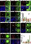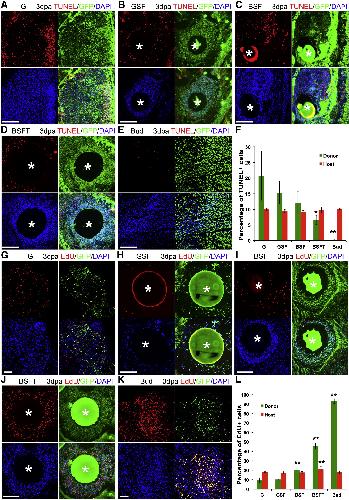 Figure 4. Cell Death and Cell Proliferation Analysis in Cell Transplants(A) Cell death detection by TUNEL in 3 day regenerates after GFP-labeled limb cell patch or bud graft. (A) Cells with GFP label alone. (B) GFP limb cell patch with Shh and FGF10. (C) βcatâ limb cell patch with Shh and FGF10. (D) βcatâ limb cell patch with Shh+FGF10+thymosin β4. (E) Whole limb bud transplantation. Sections are through the cell patch or the transplanted bud. GFP shown in green indicates the nGFP or pHsβcatâGFP donor cells. The TUNEL signal is shown in red, and nuclei are shown in blue with 46-diamidino-2-phenylindole (DAPI) stain. White asterisks (B) indicate positions of Affi-Gel beads. Scale bars, 100 μm.(F) Quantification of cell death in the transplants (G, GFP label only; S, Sonic hedgehog; F, FGF10; B, activated β-catenin; and T, thymosin β4). Error bars are standard deviations; n = 4; single-factor ANOVA shows a significant difference in groups; âp < 0.05, BSFT versus BSF; ââp < 0.01, bud versus BSFT, as determined by t test.(G) Cell proliferation determined by EdU incorporation. EdU is shown in red, and nuclei are shown in blue. White asterisks in (H)J) indicate positions of Affi-Gel beads. Scale bars, 100 μm.(L) Quantification of cell proliferation in the transplants; labels as above. Error bars are standard deviations; n = 4; ANOVA and t test analysis show significant differences between groups. ââp < 0.01, as determined by t test. |
