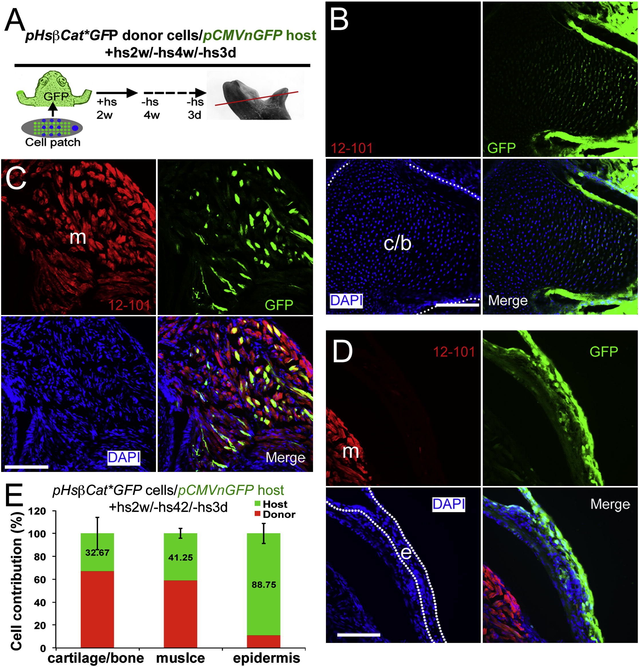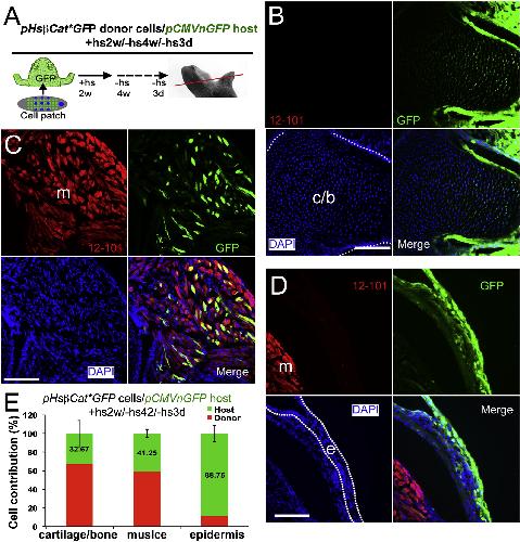 Figure 7. Analysis of Cell Contribution in Limb Regenerates after (pHsβcatâGFP Donor)/(pCMVnGFP Host) Transplantations(A) Diagram of cell contribution analysis. pCMVnGFP host frogs were used, and GFP expression in pHsβcatâGFP donor cells was turned off by not giving heat-shock treatments. Thus, GFP+ cells shown in (B)D) are from the host. The red line indicates the level of sections shown in (B)D).(B) Detection of host cells (green) in cartilage (B), muscle (C), and epidermis (D). Cartilage, muscle, and epidermis are shown as in Figure 6. Scale bars, 100 μm.(E) Quantification of donor and host cell contributions in limb regenerates from (pHsβcatâGFP donor cells)/(pCMVnGFP host) transplantations. Error bars, standard deviation; n = 9 animals.See also Figures S2 and S3. |