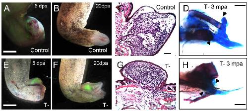 Figure S1. Comparison of graft survival and limb regeneration in normal and thymectomized hosts. (related to Fig.1). When a pCMVnGFP limb bud is grafted to a wild type host, expression of the GFP is detectable 6 days post amputation (A) but disappears soon after, so that at 20 dpa, it is no longer visible (B). In thymectomized (T-) hosts, GFP expression persists long term (E, F). Histology shows spaces in the tissue and lymphocyte accumulation in the limb bud grafted into a wild type host (C) but a normal mesenchymal appearance of the limb bud grafted into a thymectomized host (G). Two examples of limb regenerates with skeletal preparation are shown in (D) and (H). Arrow heads indicate amputation levels. Scale bars for (A, B, D, E, F, H) 500 um; Scale bars in (C, G) 100 um. |