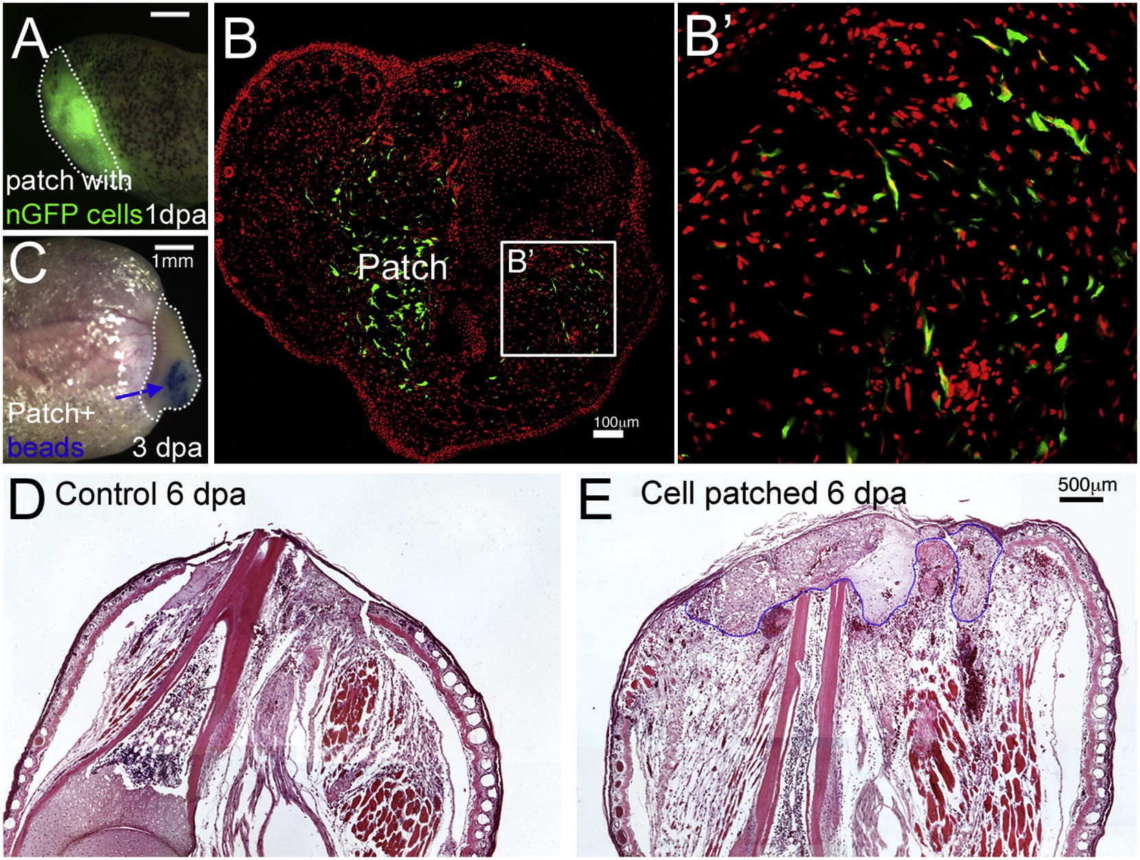 Figure 2. Delivery of Cells to the Limb Stump using a Fibrin Patch(A) A frog limb stump covered with a fibrin patch containing GFP-labeled cells, 1 dpa. The white dotted line indicates the patch. Scale bar, 1 mm.(B) Migration of nGFP (green) cells out of the patch in an early regenerate, 3 dpa. Nuclei stained with propidium iodide (PI) are shown in red. An area far away from the patch (outlined in B) is shown in (B. Scale bar, 100 μm.(C) The patch allows application of growth factor beads to the limb stump. The white dotted line outlines the patch, and the blue arrow indicates Affi-Gel beads. Scale bar, 1 mm.(D and E) Sagittal sections of limb stump with (E) or without (D) fibrin patch. The blue dotted line indicates the boundary of the patch. Scale bar, 500 μm. |