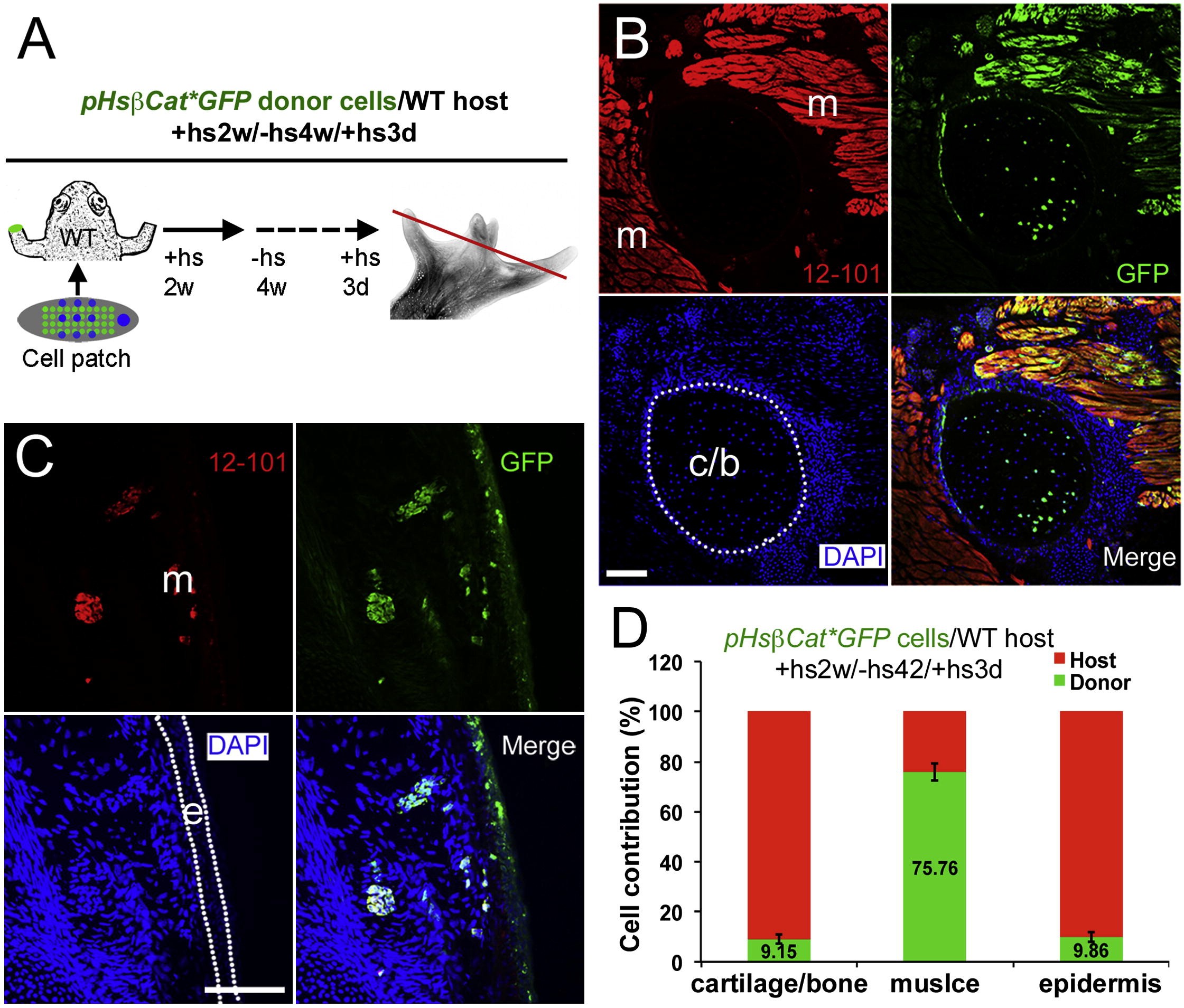 Figure 6. Analysis of Donor Cell Contribution in Limb Regenerates after (pHsβcatâGFP Donor)/(Wild-Type Host) Transplantations(A) Diagram of cell contribution analysis. Wild-type host frogs were transplanted with a βcatâ limb bud cell patch with Shh and FGF10 after amputation. Heat shock was given for the first 2 weeks to maintain βcatâ expression. Frogs were left without heat shock for 4 weeks, and heat shock was given 3 days before sample collection to activate GFP expression (fused to βcatâ) in donor cells. The red line indicates the level of sections shown in (B and C)(B and C) Detection of donor cells (green) in cartilage (B), muscle (red, with 12/101 antibody staining, B and C) and epidermis (C) in a regenerate illustrated as in (A), 45 dpa. m, muscle; c/b, cartilage or bone; and e, epidermis. Muscle tissues are shown in red as revealed by immunostaining with 12/101, a specific muscle marker, and labeled as m in the red channel images; cartilage and epidermis are outlined with white dotted lines in the blue channel images.(D) Quantification of donor and host cell contributions in limb regenerates from (pHsβcatâGFP donor)/(wild-type host) transplantations. Error bars, standard deviation; n = 9 animals.See also Figures S2 and S3. |