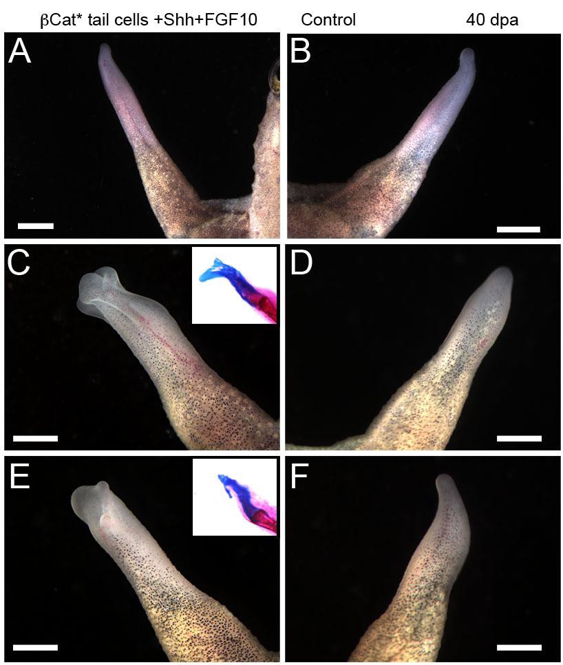 Figure S6. Failure of limb regeneration in frog transplanted with cells from pHsBeta-cat*GFP tadpole tail regeneration bud (related to Table 1). (A, B) The majority of the regenerates show no difference from controls (B). (C-F) Two cases showed slight extra cartilage formation (insets in C, E). (D, F) are spikes regenerated from the control side. dpa, day post amputation. Scale bars 250 um. |