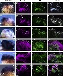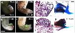 Figure S4. Joint marker expression and nerve innervation in limb regenerate (related to Fig.3). (A-C) Gdf5 is expressed in digit regenerates from Beta-cat* cell patch and Shh, Fgf10, thymosin Beta-4 treatment (BSFT, B), but not expressed in the control cartilaginous spike (A). The white rectangle in (B) indicates Gdf5 expression in a digit regenerate that is similar to the joint of a developing tadpole digit (C). Scale bars 500 um. (D-K) Nerve regeneration in limb regenerates and spikes. Immunofluorescence staining with anti-ï¢-tubulin III antibody (green) indicates abundant innervation in limb regenerate from Beta-cat* cell patch and Shh, Fgf10, thymosin Beta-4 treatment (D, BSFT). White arrows in (D) indicate nerve bundles. (E) Shows a high magnification of nerve bundles (n) that are Beta-tubulin III-positive and a glandular structure (g) that is Beta-tubulin III-negative. (F, G) Histology of a section from the same regenerate in (D) shows the distinct morphology of a nerve bundle (n) and a glandular structure (g). Scale bars in (D-G), 50 um. (H, I) Transmission electron microscopy (TEM) images of axons in limb regenerate from BSFT treatment showing multiple small (2-5 um) myelinated axons at 15K magnification (H) and a single axon (a) with numerous closely packed myelin lamellae (m) at high magnification (30K, I) (G) Immunofluorescence detection of Beta-tubulin III in a control spike, 2 mpa. The spike is innervated but there is a lack of larger nerve bundles. (H) High magnification (30K) TEM image of a single axon in spike. |