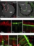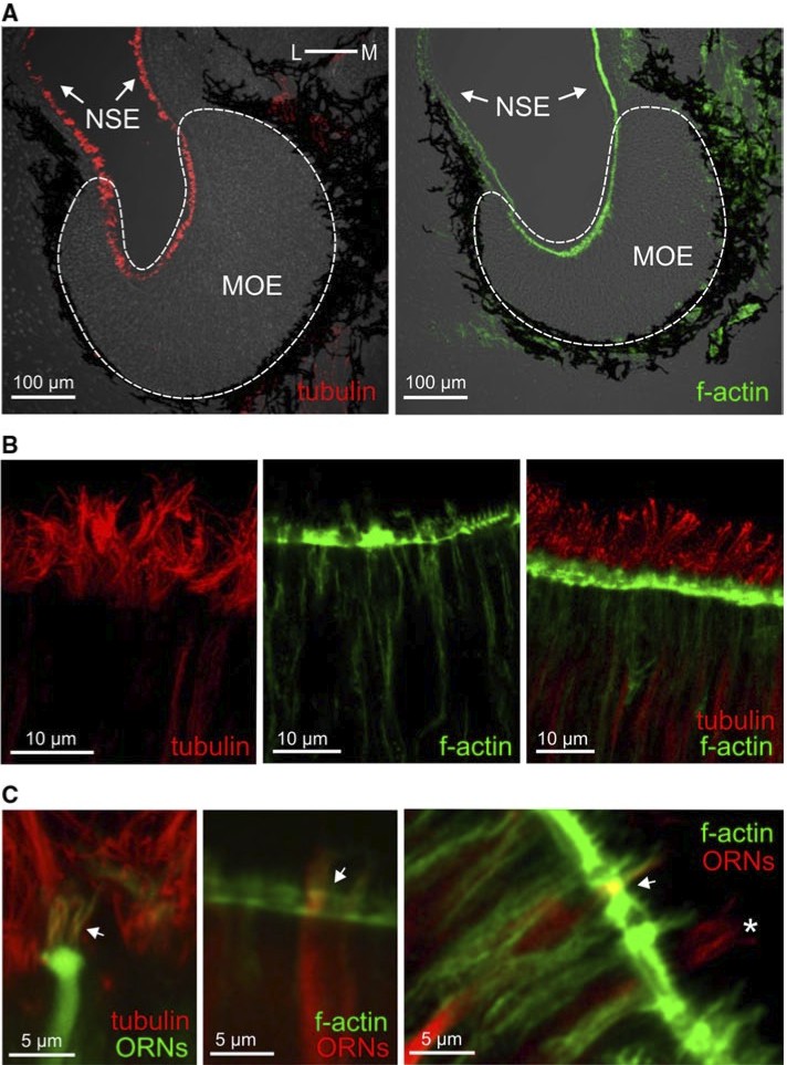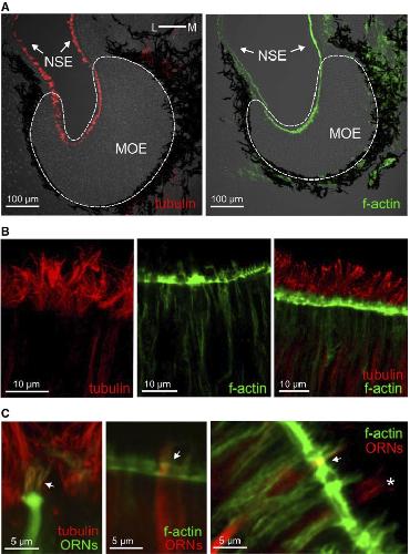 Fig. 4 Tubulin and actin identify cilia and microvilli, respectively. a antibodies against tubulin and a marker of f-actin (phalloidin) both labeled structures in the whole MOe and in the adjacent non-sensory epithelium (NSe; tubulin, left- hand panel; f-actin, right-hand panel). b higher magnifications of the apical MOe show cilia labeled with antibodies against tubulin (left-hand panel), micro- villi labeled with phalloidin (middle panel), and a double-labeled MOe (right-hand panel). c ORNs and their processes were visualized by nerve backfills with biocytin and double labeled with antibodies against tubulin (left panel, cili- ated neuron, the arrow points to cilia), and phalloidin (middle and right panels, microvillous neurons, arrows point to olfactory knobs). another backfilled neuron with somewhat longer processes (asterisk) was not labeled by phalloidin, i.e., it is a ciliated neuron. The Author(s) 2012. This article is published with open access at Springerlink.com |