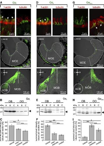 Fig. 5 G-protein immunohistochemistry in the main olfactory epi- thelium and the main olfactory bulb. antibodies against Gαi (a) and Gαo (d) preferentially labeled apical structures of ORNs located in the lateral and intermediate part of the MOe (middle row) and axon bundles of the olfactory nerve and glomeruli of the lateral and inter- mediate glomerular clusters of the MOB, as well as glomeruli in the aOB (lower row). Dotted lines indicate the approximate borders and subdivisions of MOe and olfactory bulb. Gαi and Gαo immunoreac- tivity was localized in apical endings of phalloidin-positive (arrows) and tubulin-negative microvillous olfactory receptor neurons (upper row). Gαolf/s (g) immunoreactivity showed a complementary distribu- tion, preferentially localized in ORNs and glomeruli of the medial and intermediate regions of MOe and MOB (middle and lower row, respectively). Gαolf/s in apical endings of ORNs co-localized with the ciliary marker tubulin, but not with f-actin (upper row, arrows). Western-blot analysis of Gαi (b), Gαo (e) and Gαolf/s (h) antibodies using tissue samples of olfactory organ and olfactory bulb of larval Xenopus laevis (a stages 435, b 524, and c 646, respectively). Arrows indicate bands corresponding to the predicted molecular weights of Gαi and Gαo (~40 kDa) and Gαolf/s (~44 kDa). the Gαi antibody is highly specific, whereas Gαo and Gαolf/s antibodies show minor crossreactivity to other proteins. Quantification of fluorescence intensity of G protein labeling for Gαi (c n = 9 MOes), Gαo (f n = 7 MOes) and Gαolf/s (i n = 5 MOes). Gαi and Gαo are enriched lat- erally, whereas Gαolf/s shows clear depletion in the lateral segment. Significance was evaluated by t test (*p < 0.05, **p < 0.01; error bars show SeM). A anterior, P posterior, L lateral, M medial, OO olfactory organ, OB olfactory bulb. The Author(s) 2012. This article is published with open access at Springerlink.com |