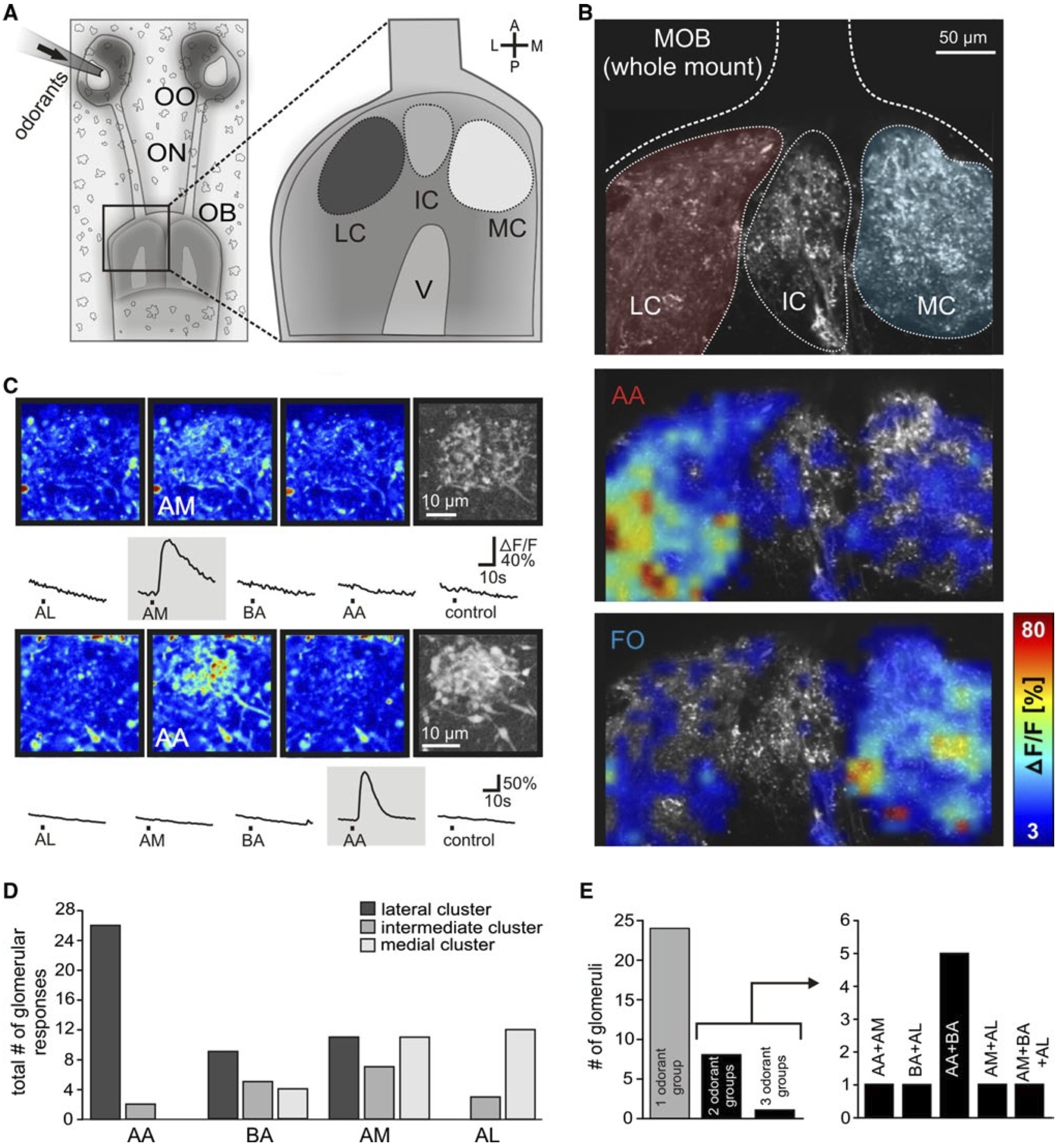 Fig. 1 Odorant responses in the glomerular layer of the main olfac- tory bulb. a Schematical representation of the noserain prepara- tion (left panel) and the three main glomerular clusters of the MOB (right panel). b Whole-mount olfactory bulb preparation stained with Fluo-4 dextran showing the three main clusters of the MOB (upper panel; LC red, MC blue). application of amino acids preferentially induced an increase in Ca2+-dependent fluorescence in the lateral cluster (intermediate panel), whereas forskolin elicited activity pre- dominantly in the medial cluster (lower panel). a representative example of seven separate experiments is shown. c Sequence of three pseudocolored images showing calcium transients of an individual glomerulus situated in the medial cluster upon application of amines. the images were taken before stimulus application, at the peak of the response and after return to the baseline fluorescence (from left to right). the fine glomerular structure of the activated glomerulus was visualized by a grayscale correlation map (rightmost image; see aterials and methodsfor details). the time courses of the [Ca2+]i transients of the glomerulus, evoked by mucosal application of the different odorant groups are given below the images. the lower group of pictures shows an individual glomerulus, situated in the lateral cluster, responsive solely to amino acids (same explanation as above). d histogram showing the location of odorant-responsive glomeruli (n = 80 glomeruli from 32 noserain preparations). e Out of 33 glomeruli tested for their responsiveness to all four odorant groups, 24 responded to one odorant group, eight responded to two odor- ant groups, and one glomerulus to three odorant groups (left panel). Odorant profiles of multiresponsive glomeruli are shown in the right panel. all odorants were applied at a final concentration of 200 μM, forskolin was applied at a final concentration of 50 μM. A anterior, P posterior, L lateral, M medial, OO olfactory organ, ON olfactory nerve, OB olfactory bulb, AA amino acids, AL alcohols, ketones, and aldehydes, AM amines, BA bile acids, FO forskolin, LC lateral glomerular cluster, IC intermediate glomerular cluster, MC medial glomerular cluster, V lateral ventricle, control application of bath solution |