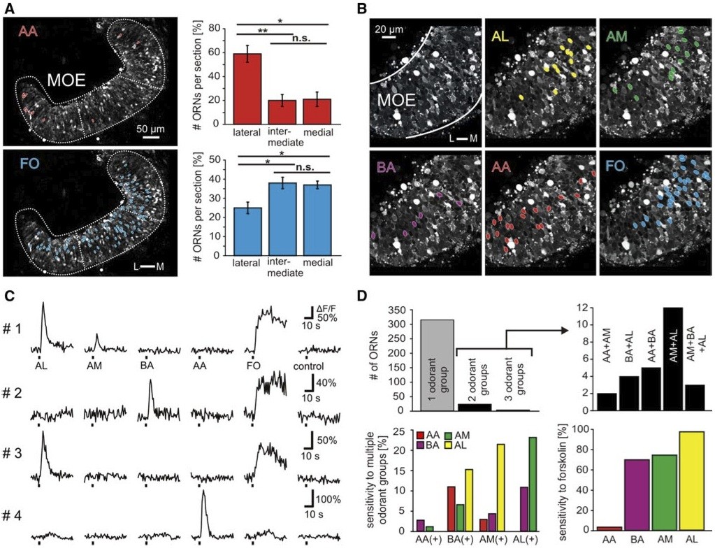 Strotmann, Olfactory neurones expressing distinct odorant receptor subtypes are spatially segregated in the nasal neuroepithelium. 1994, Pubmed