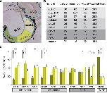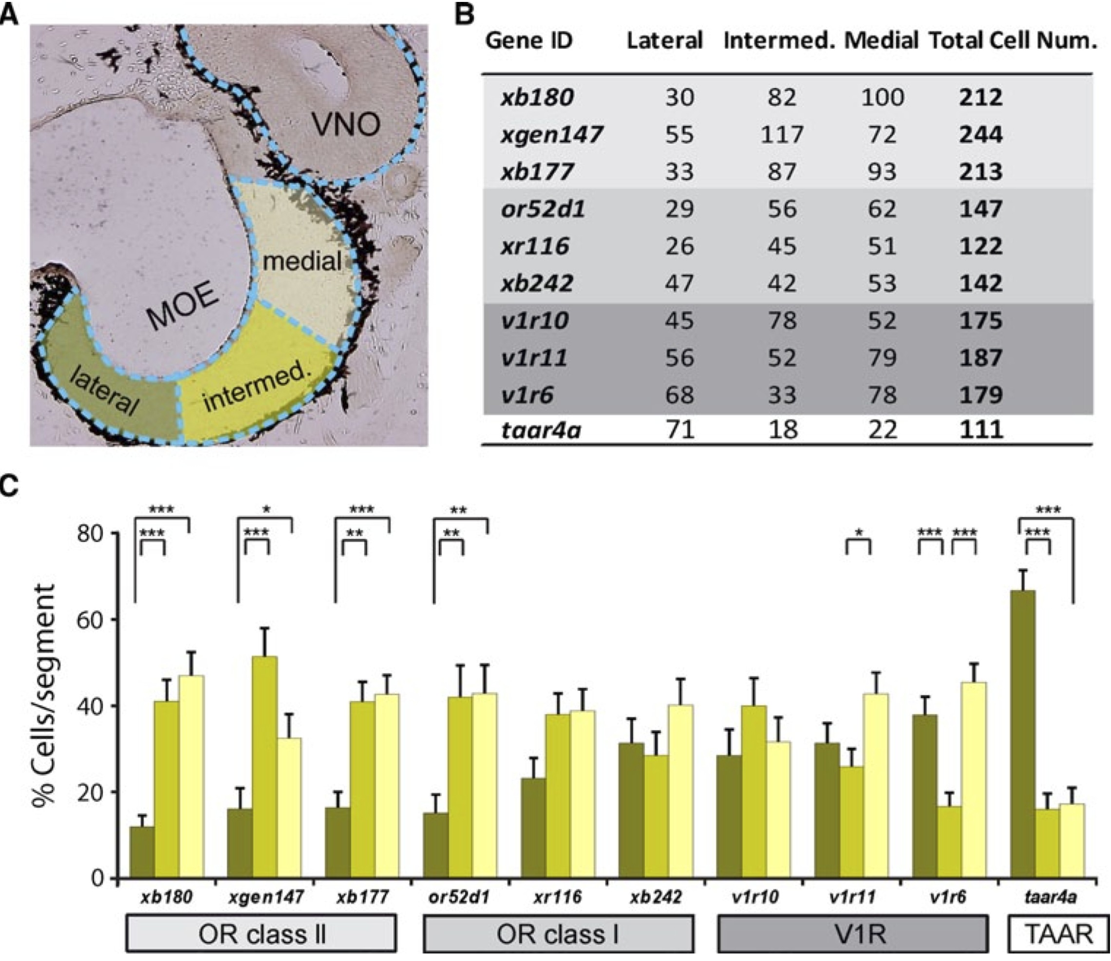 Fig. 7 Quantification of lateral-to-medial distribution of ten olfactory receptor genes. a Schematic illustration showing the three subdivisions of the MOe, lateral, intermediate, and medial, respectively. b Cumulative number of cells counted for each gene in lateral, intermediate, and medial subdivision and total number. or class II genes light grey background; or class I genes, dark grey background; v1r genes, middle grey background; taar gene, white background. c Quantita- tive evaluation of the spatial distribution for ten genes, same color code as in a, lateral (dark green), intermediate (light green) and medial (yellow) parts of the MOe. Percentage of cells in each segment was determined for each section, averaged over sections and shown as mean SeM. Significance was determined by t test and is denoted by asterisks: *p < 0.05, **p < 0.01, ***p < 0.002, error bars show SEM. © The Author(s) 2012. this article is published with open access at Springerlink.com |