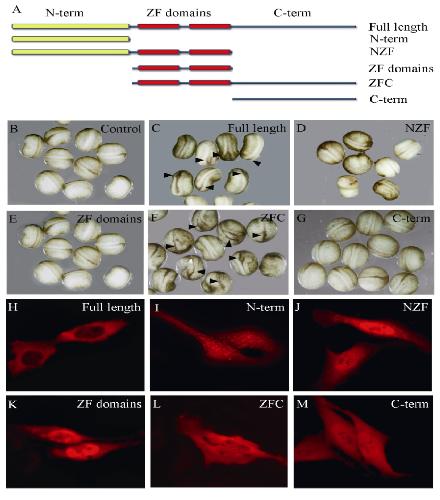 while overexpression of the NZF truncate (D) or ZF domains (E) or C-terminal truncate (G) has no obvious effect on neural tube closure; H-M: Localization of