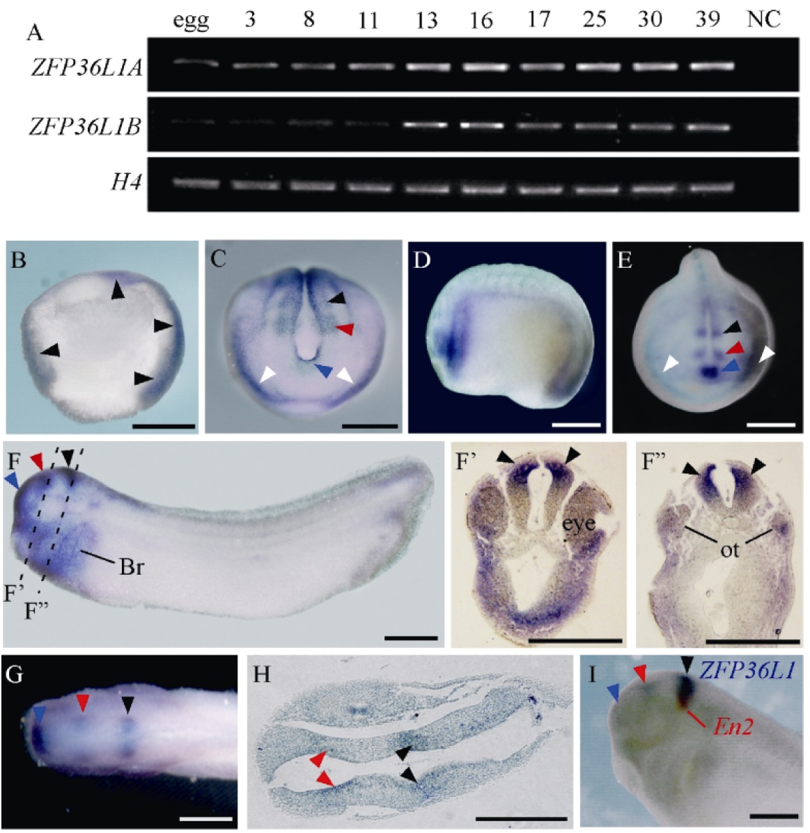 and mid-hindbrain boundary (black arrowheads); I: Double WMISH of En2 (red) and XZFP36L1 (blue). Arrowheads in (CâI) indicate the expression of