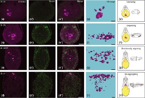 Figure 1. Localization of primordial germ cells (PGCs) in tailbud embryos. (a�d) Transverse section of embryos at stage 24 (a), 28 (b), 33/34 (c) and 41 (d). PGCs were labeled with anti-Xenopus Daz-like protein antibody (magenta; a�d). Nuclei were labeled with Hoechst 33342 (green; a′�d′) 3D images of the in vivo localization of PGCs at stage 24 (e), 28 (f), 33/34 (g) and 41 (h) were constructed with Delta Viewer. PGCs, red. Dorsal side up in all photos, with anterior to the left. (e′�h′) Schematic diagrams of localization of PGCs in tailbud embryos. Very small Dazl-positive fragments did not contain nuclei. PGCs, magenta. Endodermal region, yellow. Scale bars: 100 μm.