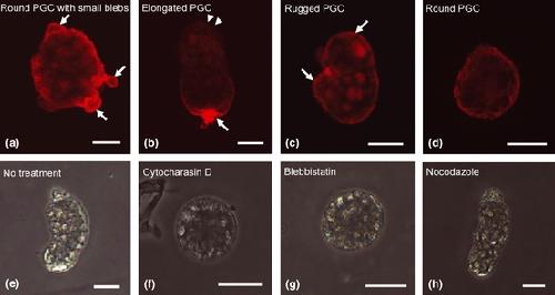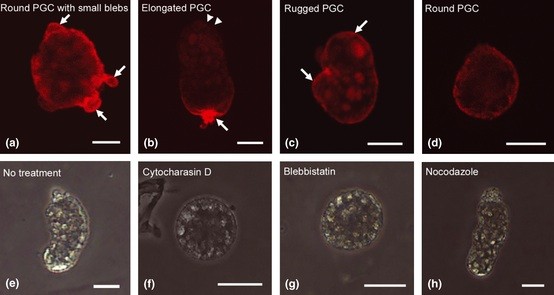 Figure 5. Localization of F-actin and roles of cytoskeletons in migrating primordial germ cells (PGCs). (a�d) Localization of F-actin in isolated PGCs. A representative PGC isolated from an embryo at each stage was stained with rhodamine-phalloidin. Arrows in (a) indicate the small blebs. Arrows in (b) indicate the rear region. Arrowheads in (b) indicate the front of an elongated PGC. Arrows in (c) indicate the large bleb. (e�h) Elongated PGCs at stage 28 were treated with indicated inhibitors. Photos were taken 30 min after adding the chemicals. Scale bars: 20 μm