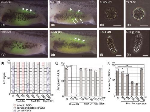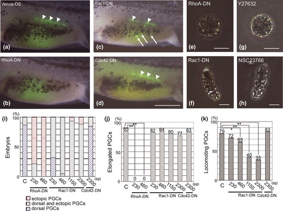 Figure 6. Effects of inhibiting Rho family GTPase signals on primordial germ cell (PGC) migration. (a�d) Lateral views of stage 41 embryos injected with Venus-DS mRNA (460 pg) (a), or co-injected with Venus-DS mRNA (460 pg) and mRNA for RhoA-DN (460 pg) (b), Rac1-DN (460 pg) (c) or Cdc42-DN (2.3 ng) (d). Dorsal side up and anterior to the left. (e, f) Isolated PGCs from stage 28 embryos injected with RhoA-DN (460 pg) or Rac1-DN (460 pg) were cultured on fibronectin-coated petridishes. (g, h) Elongated PGCs isolated from stage 28 embyos were incubated with Y27632 (ROCK inhibitor) or NSC27632 (Rac1 inhibitor). Photos were taken 30 min after adding the chemicals. Arrowheads indicate the PGCs in the normal region. Arrows indicate the ectopic PGCs. Scale bars: 1 mm in d; 20 μm in (e�h). (i) Effects of DN-small GTPases on PGC localization in vivo. Venus-DS mRNA (460 pg) was injected into all the embryos for PGC labeling, and additionally indicated mRNAs were injected. PGC localization was observed externally from both sides at stage 41. Graph shows the percentages of embryos with indicated PGCs. Values are includes results of three experiments. (j, k) Effects of DN-small GTPases on elongation (j) and locomotion (k) of isolated PGCs. Time-lapse images of the stage 28 PGCs were captured at 1 min intervals for 30 min after 1 h of cultivation. If a PGC showed an elongated shape during the culture period, it was counted as an elongated PGC. If a PGC moved more than 100 μm for 30 min, it was counted as a locomoting PGC. Values are results of three experiments. C; control injected with only Venus-DS mRNA. *P < 0.05, **P < 0.001.