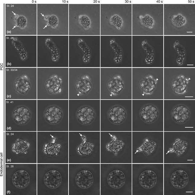 Figure 3. Time-lapse observation of isolated primordial germ cells (PGCs) and somatic cells. (a�f) A PGC isolated from stage 24 (a), 28 (b), 33/34 (c) or 41 (d), or an endodermal cell from stage 24 (e) or 28 (f) was cultured in the fibronectin-coated culture chamber. Arrows indicate small blebs. Arrowheads indicate the large clear blebs. Photos were taken at 10 s intervals after PGCs adhered to the substrate. Scale bars: 20 μm.