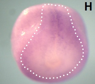 brd3 (bromodomain containing 3) gene expression in Xenopus laevis embryo, assayed via in situ hybridization, NF stage 18, anterior view, dorsal up. |