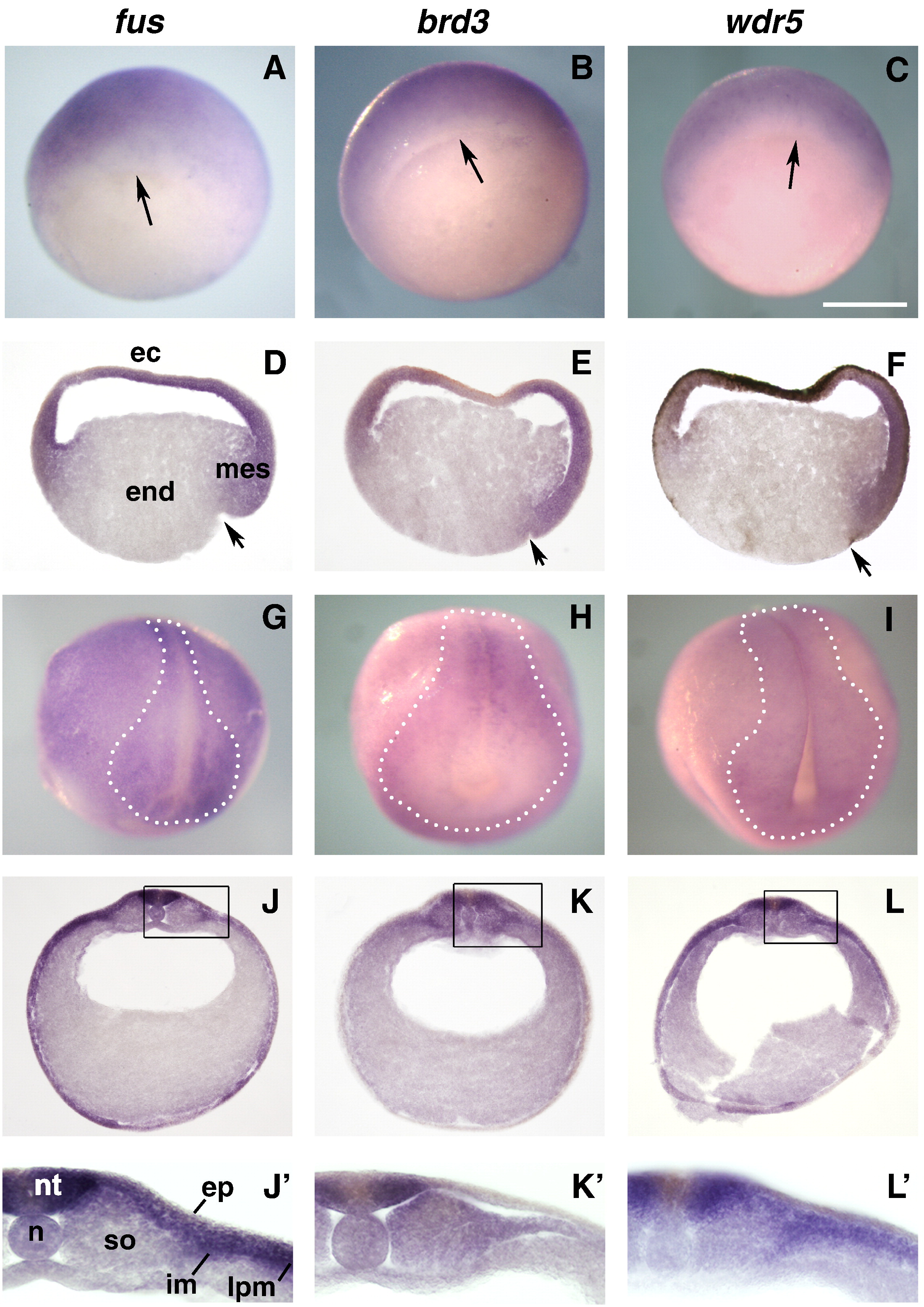 Spatial expression patterns of fus, brd3 and wdr5 mRNA during Xenopus laevis' early development. In situ hybridization is performed on embryos and sections at gastrula and neurula stages. Photomicrographs of whole mounts and sections for fus (left panels), brd3 (middle panels) and wdr5 (right panels) are shown. (AâC) At early gastrula (dorsal view, arrows indicate the position of the blastoporal lip) fus, brd3 and wdr5 transcripts are detected in the ectoderm and the mesoderm. (DâF) This pattern is confirmed by section analysis (sagittal section dorsal is on the right, arrows point to the dorsal blastoporal groove) which shows labeled ectoderm (ec) with no difference between the dorsal and the ventral sides and in the dorsal mesoderm (mes). The endoderm (end) is not labeled. (GâH) Whole-mounts at early neurula stage (anterior view, dorsal side up), expression is restricted to neural territories as indicated by the dotted areas. (JâL) Transversal section analysis (section is a trunk level, dorsal is up) shows that fus, brd3 and wdr5 are expressed in the neural tube (nt). Enlargement of respective sections (JââLâ), the epidermal ectoderm (ep) is labeled for fus (Jâ) but not for brd3 and wdr5 (Kâ, Lâ). A strong expression is present in the intermediate mesoderm (im) and in the lateral plate mesoderm (lpm) for fus and wdr5 (Jâ, Lâ) while brd3 is clearly expressed in the somitic mesoderm (so). Abbreviations: ec; ectoderm, end; endoderm, ep; epidermal ectoderm, im; intermediate mesoderm, lpm; lateral plate mesoderm, mes; mesoderm, n; notochord, nt; neural tube, so; somitic mesoderm. Scale bars 0.5 mm in (AâL). |