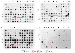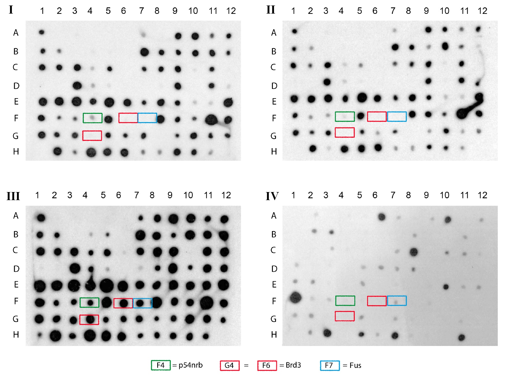 Autoradiographs of 4 replicates membranes carrying bacterially-amplified fragments corresponding to Ca2 +-enriched cDNA and hybridized with 32P-labeled probes from initial caffeine-induced cDNA population (I), control (non-induced) cDNA population (II), subtracted “sense” (caffeine minus control) cDNA population (III) and subtracted “reverse” (control minus caffeine) cDNA population (IV). The F7 spot (blue tag) corresponds to fus gene and illustrates the enrichment of gene expression as it is labeled by the enriched induced minus non induced probe and is undetectable with the initially induced population (compare I and III replicates, at F7) and absent on II and IV replicates. brd3 was found twice on this spotted membrane, at F6 and G4 spots (red tag) and exhibits the same response than fus. p54nrb gene on F4 deposit (green tag) is revealed with both initial and subtracted “sense” probes and is not labeled with non-induced “reverse” populations. The wdr5 expression in caffeine-treated animal cap explants corresponded to the G1 load in the original report [10]. GFP was spotted on H12 as a negative control. |