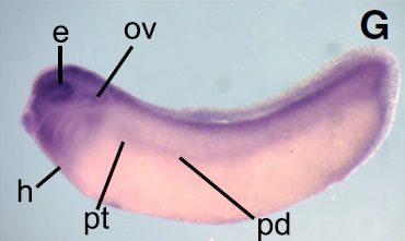 Spatial expression patterns of fus, brd3 and wdr5 at taibud and tadpole stages in Xenopus laevis. In situ hybridization is performed on embryos and sections at early (AâF), late tailbud (GâL) and tadpole (MâR) stages. Photomicrographs of whole mounts and sections for fus (left panels), brd3 (middle panels) and wdr5 (right panels) are shown. (AâC) At early tailbud fus, brd3 and wdr5 transcripts are expressed in anterior neural structures; telencephalon (Te), mesencephalon (Me) and rhombencephalon (Rh) and in the optic cup (oc). A strong expression is detected in the branchial arches (ba) for fus and wdr5 (A, C). The cement gland (cg) expressed brd3 and wdr5 (B, C). The tail bud (tb) and the pronephros (p) express fus at this stage (A). (DâE) Transversal sections at the level of the pronephros show the expression of all three transcripts in the spinal cord (sp), the pronephric tubule (pt) and the lateral plate mesoderm (lpm), and the endodermal yolk mass (end), notochord (n) and somites (so) are not labeled. (GâI) Late tailbud stage shows similar labeling patterns to the early tailbud. In addition, the pronephric tubule (pt) and duct (pd) are clearly labeled for fus; and the heart territory (h) for fus and wdr5 (G, I). (JâL) Transversal sections at the level of the pronephros confirm these patterns of expression and reveal that the level of brd3 transcripts decreases at this stage. (MâO) Whole-mounts and (PâR) transversal sections at pronephros level tadpole stage. Section analysis at this stage reveals that fus transcripts remain expressed in spinal cord (sp) and pronephric tubules (pt) brd3 and wdr5 are undetectable in these structures. Abbreviations: ba; branchial arches, cg; cement gland, e; eye, end; endodermal yolk mass, h; heart territory, lpm; lateral plate mesoderm, Me; mesencephalon, n; notochord, oc; optic cup, ov; otic vesicle, p; pronephros, pd; pronephric duct, pt; pronephric tubule, Rh; rhombencephalon, so; somite, sp; spinal cord, tb; tail bud, Te; telencephalon. |