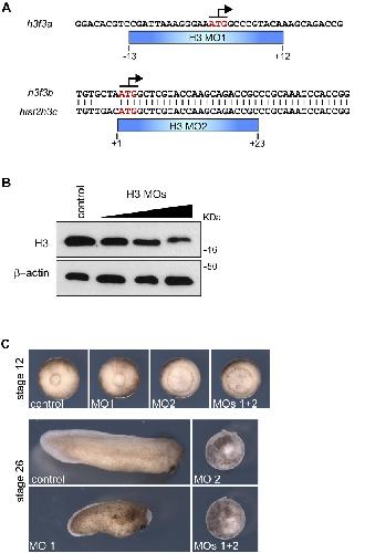 Fig. S3. Developmental defects in embryos partially or completely depleted of H3.3. (A) Target regions of H3 MO1 and MO2. (B) Western blot analysis showing dose-dependent depletion of endogenous H3 proteins in H3 MO-injected embryos. Doses of H3 MOs tested were 6.5 ng, 26 ng and 65 ng. (C) Development of control or embryos injected with H3 MO1 or MO2 alone or MO1+MO2 at stages 12 and 26. |
