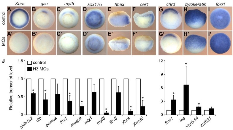 Fig. 2. H3.3/H3-depleted Xenopus embryos fail to express mesodermal marker genes. (A-Iâ²) Control and injected embryos fixed at early gastrula were subjected to RNA in situ hybridization for the analysis of mesodermal (A-Câ²), endodermal (D-Fâ²) and ectodermal (G-Iâ²) marker gene expression. Representative embryos from three experiments are shown. (A-D,G) Vegetal views; (E,F) lateral views of bisected embryos, dorsal towards the right; (H) lateral view; (I) animal view. (J) Expression of selected genes in control and H3 MO-injected embryos at stage 10.5 was measured by qRT-PCR. All values were normalized to ornithine decarboxylase (ODC) and plotted relative to the respective transcript levels in control embryos. Error bars indicate s.d. of three independent experiments. *P<0.05 using a two-tailed Student t-test. |