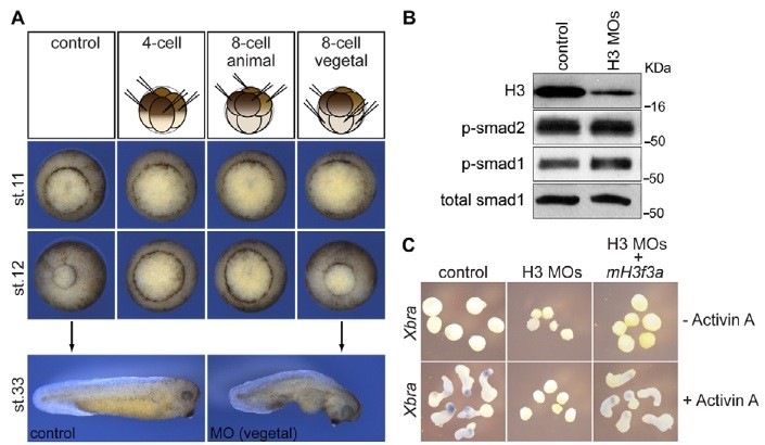 Fig. 3. H3.3/H3 depletion leads to the loss of mesodermal competence in ectodermal cells. (A) Time-lapse images show the development of control and embryos injected with H3 MOs in either all blastomeres at the four-cell stage, or four animal or vegetal blastomeres at the eight-cell stage.