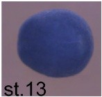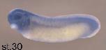 h3-3b (H3.3 histone B) gene expression in Xenopus laevis embryo, assayed via in situ hybridization, NF stage 13, dorsal view, anterior right.