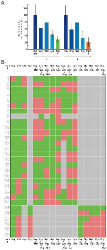 Figure 2. Response profiles of ORNs to amino acid and peptide stimulation.(A) Relative number of amino acid-sensitive ORNs reacting to individual amino acids (200 µM) or at least to one of the thirteen tested peptides. Only a fraction of amino acid-responsive ORNs also responded to group I peptides (1 mM, 12 of 42 ORNs in four slices) or group II peptides (200 µM, 6 of 28 ORNs in four slices). The fraction of ORNs sensitive to group I peptides did not differ from the fraction of ORNs sensitive to group II peptides. (B) Response matrix of all peptide-sensitive ORNs to the applied stimuli (green, response to applied stimulus; red, no response; grey, not tested; applied peptide concentration: ORN #1–#12, 1 mM; ORN #13–#21, 5 mM; ORN #22–#24, 10 mM; ORN #25–#31, 200 µM). [AA mix: amino acid mixture, AA: amino acids, Arg: L-arginine, Met: L-methionine, Lys: L-lysine, Gly: glycine, Pep I: group I peptides, Pep II: group II peptides]. |