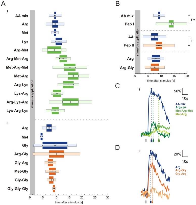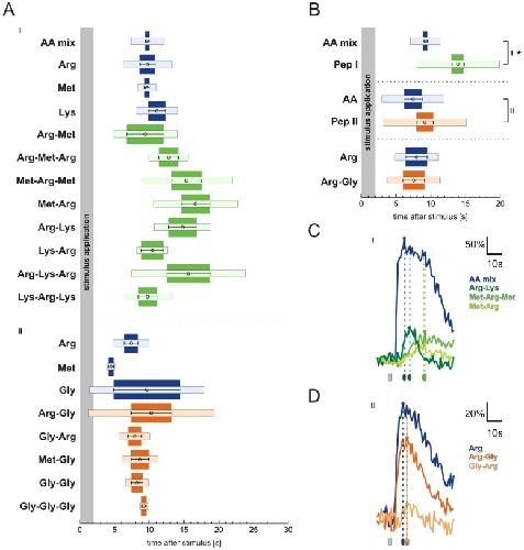 Figure 4. Group I and group II peptides elicit significantly different [Ca2+]i transients in individual olfactory receptor neurons.(A) The mean time points of amino acid- and peptide-evoked calcium transient maxima varied for individual stimuli. Transients evoked by group I peptides show a tendency to reach their maximum amplitude later if compared to amino acid stimulations (green, group I peptides, 1 mM; number of responses averaged: AA mix, 67; L-arginine (Arg), 10; L-methionine (Met), 11; L-lysine (Lys), 6; L-arginyl-L-methionine (Arg-Met), 3; L-arginyl-L-methionyl-L-arginine (Arg-Met-Arg), 4; L-methionyl-L-arginyl-L-methionine (Met-Arg-Met), 9; L-methionyl-L-arginine (Met-Arg), 9; L-arginyl-L-lysine (Arg-Lys), 4; L-arginyl-L-lysyl-L-arginine (Arg-Lys-Arg), 7; L-lysyl-L-arginyl-L-lysine (Lys-Arg-Lys), 7; L-lysyl-L-arginine (Lys-Arg), 2; out of 12 ORNs, four OE slices; orange, group II peptides, 200 µM; number of responses averaged: L-arginine (Arg), 7; L-methionine (Met), 3; glycine (Gly), 3; L-arginyl-glycine (Arg-Gly), 10; glycyl-L-arginine (Gly-Arg), 4; L-methionyl-glycine (Met-Gly), 4; glycyl-glycine (Gly-Gly), 4; glycyl-glycyl-glycine (Gly-Gly-Gly), 2; out of six ORNs, four OE slices). (B) A combined analysis reveals that calcium transients evoked by applications of group I peptides show a significant delay of their maximum amplitude if compared to responses to the mixture of amino acids. In contrast, response maxima evoked by group II petides are not significantly shifted in comparison to amino acid controls. Even more clearly, response maxima evoked by L-arginyl-glycine (Arg-Gly) are not shifted if compared to maxima evoked by L-arginine in L-arginine-specific ORNs (not responsive to the other two amino acids L-methionine and glycine). Bars indicate standard deviation and error bars represent the standard error of the mean (*, p<0.0001; unpaired t-test, number of evaluated responses for the first group, AA mix: 67 responses, Pep I: 45 responses, 12 cells, four OE slices; for the second group, AA: 12 responses, Pep II: 25 responses, six cells, four OE slices; and for exclusively L-Arginine positive ORNs, Arg: four responses, Arg-Gly: six responses). (C) Typical responses upon application of amino acids and group I peptides. The maximum amplitude of [Ca2+]i transients induced by group I peptides is smaller and shows a significant delay in comparison to [Ca2+]i transients induced by amino acids. Circles and dotted lines indicate the maximum amplitude of each response. AA mix (200 µM, blue), L-arginyl-L-lysine (Arg-Lys; 1 mM, dark green), L-methionyl-L-arginyl-L-methionine (Met-Arg-Met; 1 mM, green), L-methionyl-L-arginine (Met-Arg; 1 mM, light-green). The odorant application is marked by a grey bar. (D) Representative example of [Ca2+]i transients of an ORN sensitive to L-arginine (200 µM, blue), L-arginyl-glycine (Arg-Gly; 200 µM, orange) and glycyl-L-arginine (Gly-Arg; 200 µM, light-orange). Calcium signals evoked by L-arginyl-glycine showed the highest mean maximum amplitude of all tested peptides. In both peptide responses, the maximum amplitude is not shifted in comparison to the arginine application. [AA mix: amino acid mixture, AA: amino acids, Arg: L-arginine, Met: L-methionine, Lys: L-lysine, Gly: glycine, Pep I: group I peptides, Pep II: group II peptides]. |