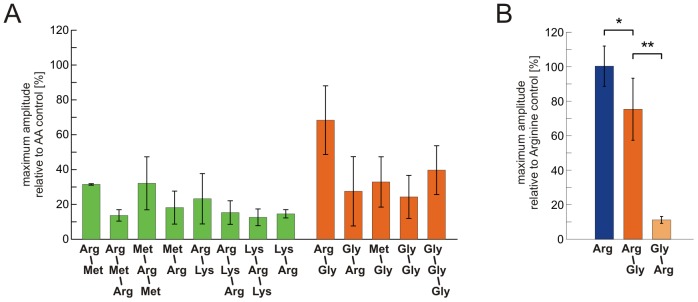 Figure 3. Peptide stimulation evokes calcium transients with lower maximum amplitude than stimulation with amino acids.(A) The maximum amplitude of [Ca2+]i increases upon peptide application (green, group I, 1 mM; orange, group II, 200 µM) is much lower than upon application of amino acids (200 µM; number of responses averaged: L-arginyl-L-methionine (Arg-Met), 2; L-arginyl-L-methionyl-L-arginine (Arg-Met-Arg), 4; L-methionyl-L-arginyl-L-methionine (Met-Arg-Met), 9; L-methionyl-L-arginine (Met-Arg), 9; L-arginyl-L-lysine (Arg-Lys), 4; L-arginyl-L-lysyl-L-arginine (Arg-Lys-Arg), 7; L-lysyl-L-arginyl-L-lysine (Lys-Arg-Lys), 7; L-lysyl-L-arginine (Lys-Arg), 2; out of 12 ORNs, four OE slices; L-arginyl-glycine (Arg-Gly), 10; glycyl-L-arginine (Gly-Arg), 4; L-methionyl-glycine (Met-Gly), 4; glycyl-glycine (Gly-Gly), 4; glycyl-glycyl-glycine (Gly-Gly-Gly), 2; out of six ORNs, four OE slices). (B) Of the five group II peptides only the dipeptide L-arginyl-glycine (Arg-Gly) featured a stimulus-induced maximum amplitude of [Ca2+]i increases comparable to stimulation with L-arginine (only ORNs exclusively sensitive to the amino acid L-arginine, i.e. #27–#30 taken into account). In contrast, the dipeptide glycyl-L-arginine (Gly-Arg) showed a weak response (averaging of multiple applications of glycyl-L-arginine (Gly-Arg); *, p<0.05; **, p<0.001, paired t-test, error bars represent standard deviation). [AA: amino acids, Arg: L-arginine]. |