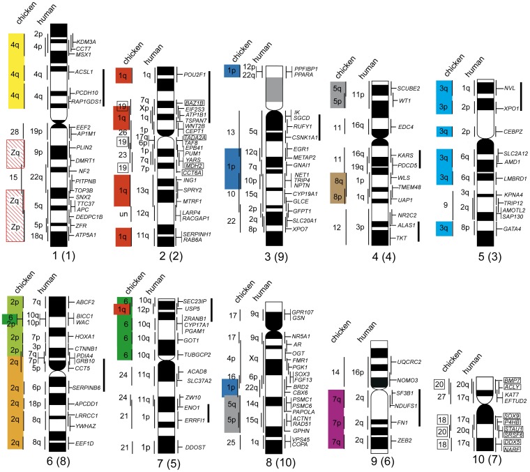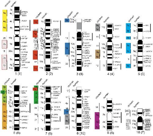 Figure 4. Comparative cytogenetic map of Xenopus (Silurana) tropicalis.Homologous chicken and human chromosomes are shown to the left of each X. tropicalis chromosome (see Table S3). Genetic linkages of chicken macrochromosomal arms and/or macrochromosomes are represented by the same colored bars as those in Figure 2. The G-banded ideograms of X. tropicalis chromosomes were taken from our previous report [40]. Chromosomes are ordered in accordance with Hellsten et al. [20]. Numbers in parentheses indicate chromosome numbers from our previous report [40]. Solid bars to the right of the X. tropicalis chromosomes indicate the chromosomal segments in which intrachromosomal rearrangements occurred between X. tropicalis and chicken. Gene symbols and chicken chromosome numbers enclosed in boxes indicate the chromosomal segments that corresponded to chicken microchromosomes in which intrachromosomal rearrangements had occurred. un, chromosomal location is unknown. |