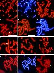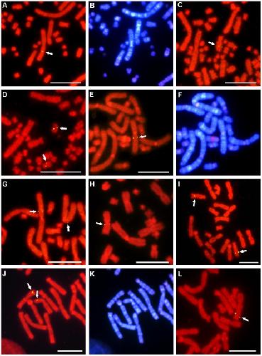 Figure 1. Chromosomal localization of functional genes in P. sinensis, C. siamensis, and X. tropicalis.Localization of cDNA clones to chromosomes of P. sinensis (AâD), C. siamensis (EâH), and X. tropicalis (IâL) by FISH. The COLEC12 (A), COQ6 (C), and SCG2 (D) genes were localized, respectively, to chromosomes 2q and 5q, and the long arms of a submetacentric microchromosomal pair in P. sinensis. The PDCD6 (E), SON (G), and ATP6V1E1 (H) genes were localized, respectively, to chromosomes 3q, 1p, and 4q in C. siamensis. The ACTN1 (I), USP5 (J), and LARP4 (L) genes were localized, respectively, to chromosomes 8q, 7p, and 2q in X. tropicalis. Hoechst-stained patterns of the PI-stained metaphase spreads in (A), (E), and (J) are shown in (B), (F), and (K), respectively. Scale bars represent 10 µm. Arrows indicate the fluorescence signals. |