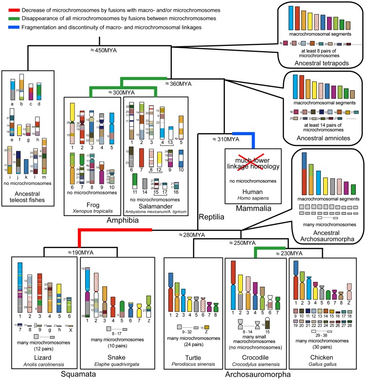 Figure 5. Schematic representation of the protokaryotypes of amniotes and tetrapods and their evolutionary processes.The schematic diagrams of the vertebrate chromosomes are modified from the genome and/or chromosome maps of Ambystoma mexicanum/A. tigrinum