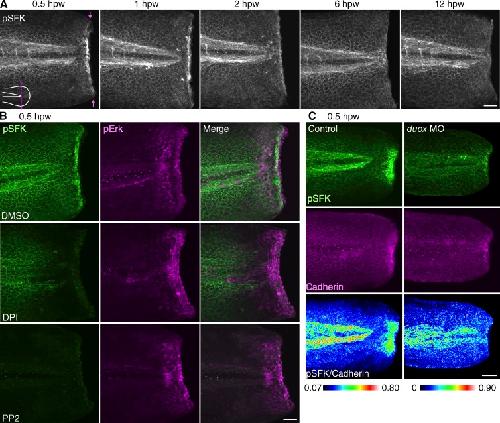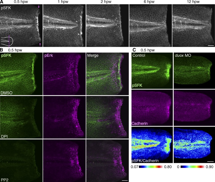 Figure 1. Redox and SFK signaling at wounds. (A) Immunofluorescence of pSFK (phosphorylation of SFK activation loop tyrosine) in 3-dpf larvae at various time points. Arrows indicate the position of tail transection. The dotted line is the position of tail transection. (B) Immunofluorescence of pSFK and pErk in 3-dpf larvae at 30 min after tail transection. DPI and PP2 inhibit SFK activation at wounds but not Erk activation. (C) Immunofluorescence of pSFK and Cadherin in 2.5-dpf larvae at 30 min after tail transection. hpw, hour postwounding. Bars, 50 µm.