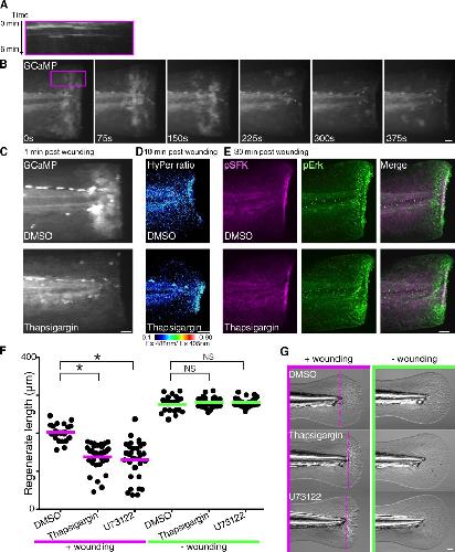Figure 3. Wound-induced Ca2+ signaling is important for late regeneration. (A) Kymograph in the rectangular box in B. The rectangular box was summed into a 1D line, and the kymograph was made. (B) Time-lapse imaging of GCaMP3 in a 2-dpf larva immediately after wounding (see Video 1). (C) GCaMP3 images in DMSO- or thapsigargin-treated 2-dpf larvae (Video 2). (D) H2O2 imaging with HyPer in DMSO- or thapsigargin-treated 2-dpf larvae. Thapsigargin does not inhibit H2O2 burst at wounds. (E) Immunofluorescence of pSFK and pErk in DMSO- or thapsigargin-treated 2-dpf larvae. Thapsigargin did not inhibit pSFK or pErk at wounds. (F) Quantification of tail fin length at 3 d after treatment (+wound/DMSO: 23 larvae; +wound/thapsigargin: 32 larvae; +wound/U73122: 32 larvae; −wound/DMSO: 21 larvae; −wound/thapsigargin: 32 larvae; −wound/U73122: 30 larvae). Horizontal lines indicate means. (G) Representative pictures at 3 d after treatment. 2-dpf larvae were treated and wounded as described in Fig. 2 A. Dotted lines indicate tail transection. *, P < 0.05; one-way ANOVA with Dunnett’s posttest. Ex, excitation. Bars, 50 µm.