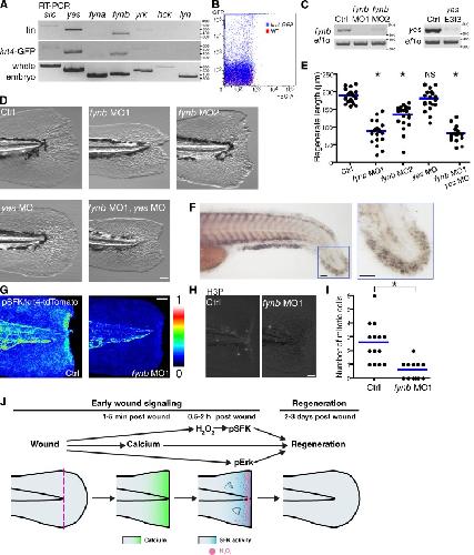 ???displayArticle.abstract??? Tissue injury can lead to scar formation or tissue regeneration. How regenerative animals sense initial tissue injury and transform wound signals into regenerative growth is an unresolved question. Previously, we found that the Src family kinase (SFK) Lyn functions as a redox sensor in leukocytes that detects H(2)O(2) at wounds in zebrafish larvae. In this paper, using zebrafish larval tail fins as a model, we find that wounding rapidly activated SFK and calcium signaling in epithelia. The immediate SFK and calcium signaling in epithelia was important for late epimorphic regeneration of amputated fins. Wound-induced activation of SFKs in epithelia was dependent on injury-generated H(2)O(2). A SFK member, Fynb, was responsible for fin regeneration. This work provides a new link between early wound responses and late regeneration and suggests that redox, SFK, and calcium signaling are immediate "wound signals" that integrate early wound responses and late epimorphic regeneration.