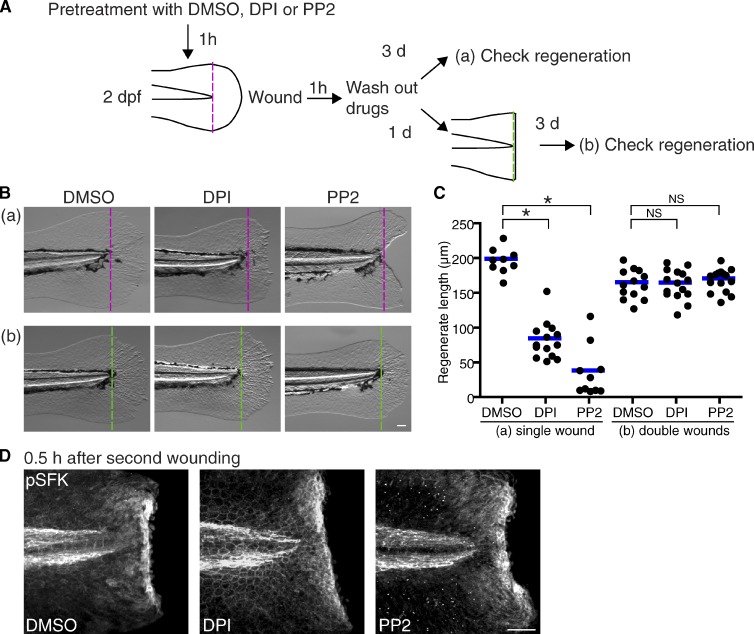 Figure 4. Second injury induces regeneration in regeneration-defective wounds. (A) Diagram of the double-wounding assay. (B) Representative pictures of single-wounded larvae (a) and double-wounded larvae (b) at 3 d after wounding. Dotted lines indicate tail transection. (C) Quantification of regenerated tail fin length at 3 d after wounding (single wound/DMSO: 9 larvae; single wound/DPI: 14 larvae; single wound/PP2: 10 larvae; double wound/DMSO: 13 larvae; double wound/DPI: 15 larvae; double wound/PP2: 15 larvae). Horizontal lines indicate means. (D) Immunofluorescence of pSFK at 0.5 h after second wounding. *, P < 0.05; one-way ANOVA with Dunnett’s posttest. Bars, 50 µm.