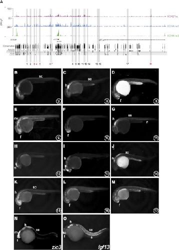 Figure 5. Enhancer activity of PDREs analyzed in stable (F1) zebrafish transgenic lines. (A) Distribution of H3K4me3, H3K4me1, and H3K27ac tracks along 500 kb spanning the zic3 locus at 24 hpf. Shaded in gray are 18 PDREs assayed for enhancer activity in zebrafish transgenic embryos. These PDREs show different degrees of evolutionary conservation as indicated by the conservation tracks below. Out of 18 tested regions, six regions did not exhibit enhancer activity (red numbers). (B–O) Lateral views of 24-hpf zebrafish embryos. (B–M) GFP expression driven by the PDREs indicated in the lower right corner of each panel. (N,O) Expression patterns of zic3 and fgf13a genes at the same stage. Forebrain (f); midbrain (m); hindbrain (h); otic vesicle (ov); spinal cord (sc), notochord (n) and somites (s).