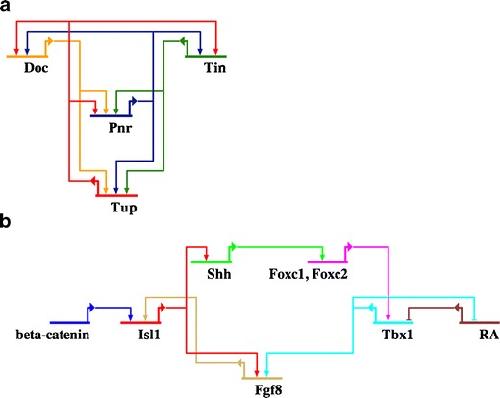 Fig. 5. Gene regulatory networks in cardiac cells including Isl1. a Interaction of key cardiac transcription factors in the early cardiac mesoderm in Drosophila. doc: dorsocross, tup: tailup, pnr: pannier, tin: Tinman. b Interaction of signaling molecules and transcription factors including Isl1 in the pharyngeal mesoderm/SHF in the mouse. Shh: sonic hedgehog, RA: retinoic acid, Fgf8: fibroblast growth factor 8 |