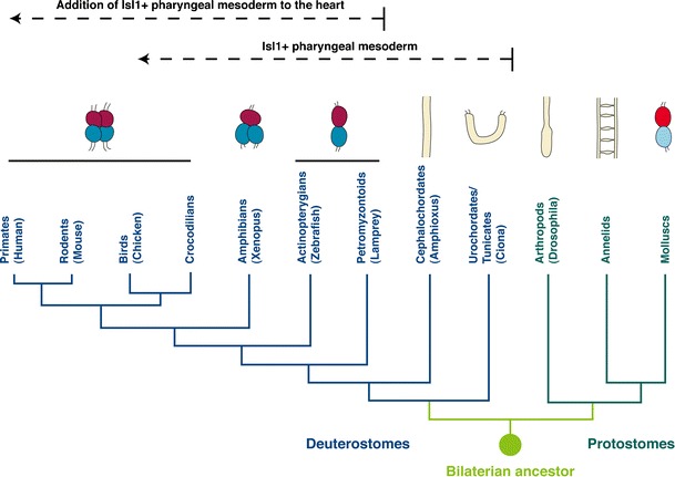 Fig. 1. The evolutionary relationship of the organisms discussed in this review and a schematic presentation of the gross morphology of their pumping organs. Ventricular chambers are depicted in red; atrial chambers are shown in blue. The atrium and ventricle in molluscs are colored in light blue and light red since it is not clear whether they are indeed homologous to their vertebrate counterparts. The dashed arrows indicate the appearance of Isl1-positive pharyngeal mesodermal cells in deuterostomes that contribute to the head musculature and, in craniata, to the heart. The phylogenetic tree is based on Simoes-Costa et al. (2005) |