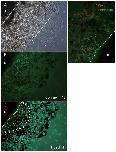FIG. 2. Xenopus RPE with choroid cultured for 82 days. A: A phase-contrast micrograph of culture on Day 12. Four different zones can be recognized from the cell morphology. In A, the explant zone (asterisk), epithelial zone, transition zone, and differentiation zone are shown from left to right, demarcated by dotted lines. B: Connexin 43 immunoreactivity is found in cells of the epithelial zone. C: Hoechst staining indicates cells become more flattened in the transition zone. D: Double staining for Pax6 (orange color) and connexin 43 (green color) in culture on Day 8. Intense Pax6 localization appears to be found in the nuclei of cells at the transition zone. Asterisk indicates the explant, and the dotted line is the boundary between the explant and the epithelial zone.
