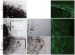 FIG. 5. Neuronal differentiation in Matrigel embedding culture of an explant consisting of RPE and choroid and the effect of Dispase treat- ment. Tissues were treated with Dispase. The explants were then embedded in Matrigel and cultured for 26 days. A: An overview image of the culture. The explant is at the center of the micrograph, and numerous cells and long branching fibers extend out from the periphery of the explant. Fibers often form a bundle (arrow). Phase-contrast micrograph. B: Acetylated tubulin immunocytochemistry shows intensely stained long fibers extending at the periphery of the gel. C, D: No treatment with Dispase, and (E, F) treatment with Dispase for 48 h. (D, F) show images of a higher magnification of C and E, respectively. Black arrows in C and D and white arrows in E and F indicate the positions of Bruch membranes. Arrowheads in F show the nuclei of RPE cells disposed randomly. C: Sections were stained with hematoxylin and eosin.