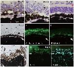 FIG. 6. Regeneration of neural retinal tissues in Matrigel-embedding culture of RPE and choroid after Dispase treatment. A: Day 5, B: Day 10, C: Day 30. In A, the epithelium has grown to form a stratified type of epithelium, and RPE cells facing the Bruchmembrane (arrow) are more densely pigmented. In C, the unpigmented stratified type of epithelium has become separated from the RPE layer, which is on Bruch membrane (arrow). In C, a well-developed layer of cells is observed, and the ganglion cell layer and the inner plexiform layer (red arrow) can be recognized. A: Sections were stained with hematoxylin and eosin. D: are sections neighboring each other. D: transmis- sion image, (E) acetylated tubulin immunocytochemisty, and (F) rhodopsin immunocytochemistry. Arrows indicate the position of Bruch membrane. G: A section of an explant without Dispase treatment. The arrow demarcates RPE cells from the choroid (asterisk). H, I: Pax6 immunocytochemistry in a Matrigel-embedding culture on Day 3. In H, Pax6-positive cells are located at the upper surface of the RPE. The lower cells close to Bruch membrane (indicated by arrows) are negative for Pax6. I: Hoechst staining of the same section.